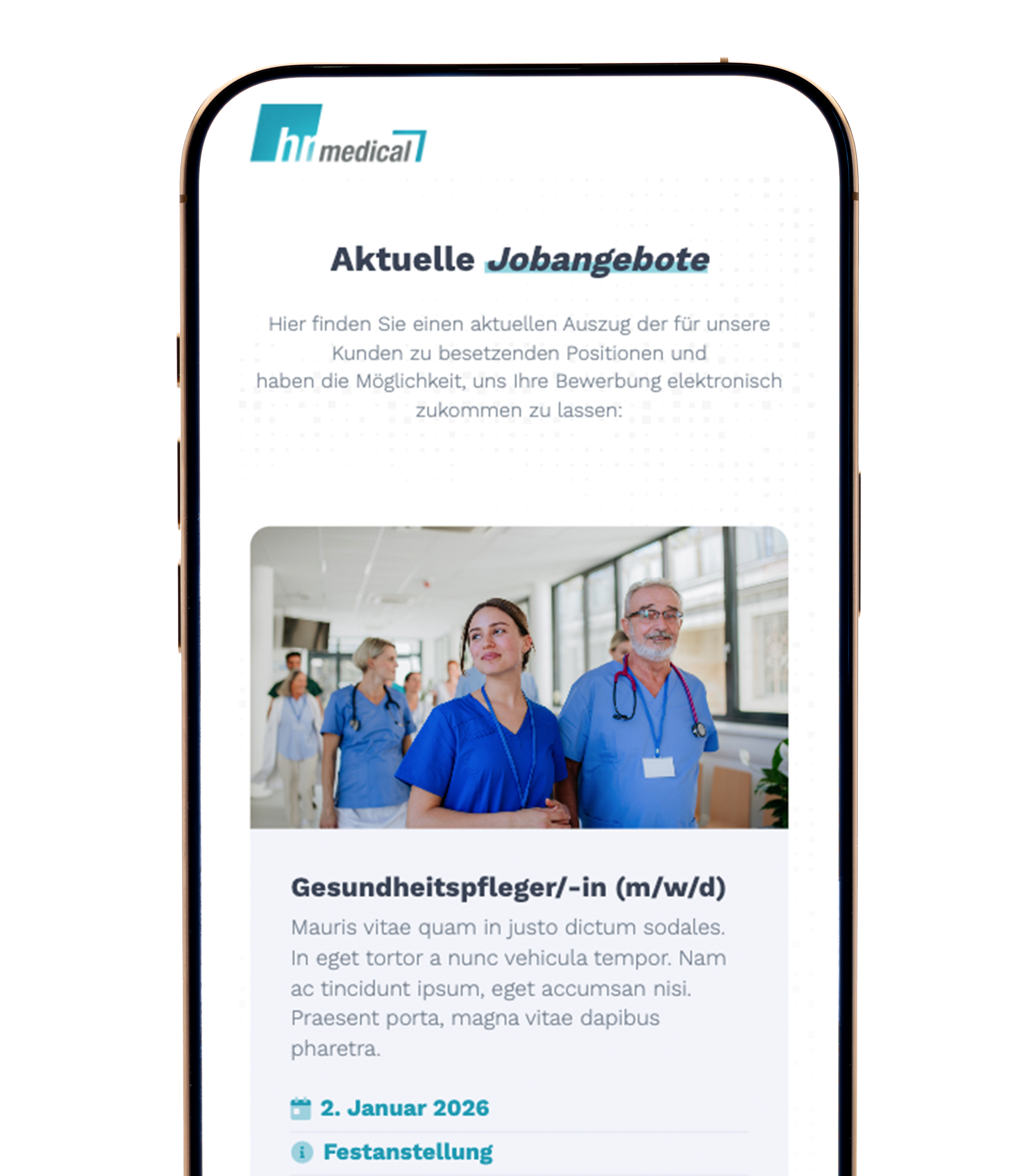 Sie möchten sich beruflich weiterentwickeln, neue Einrichtungen kennenlernen oder von flexiblen Arbeitsmodellen profitieren? Die hr medical GmbH bietet Ihnen vielfältige Einsatzmöglichkeiten im medizinischen Bereich – individuell abgestimmt auf Ihre Qualifikation, Ihre Wünsche und Ihre Lebenssituation.